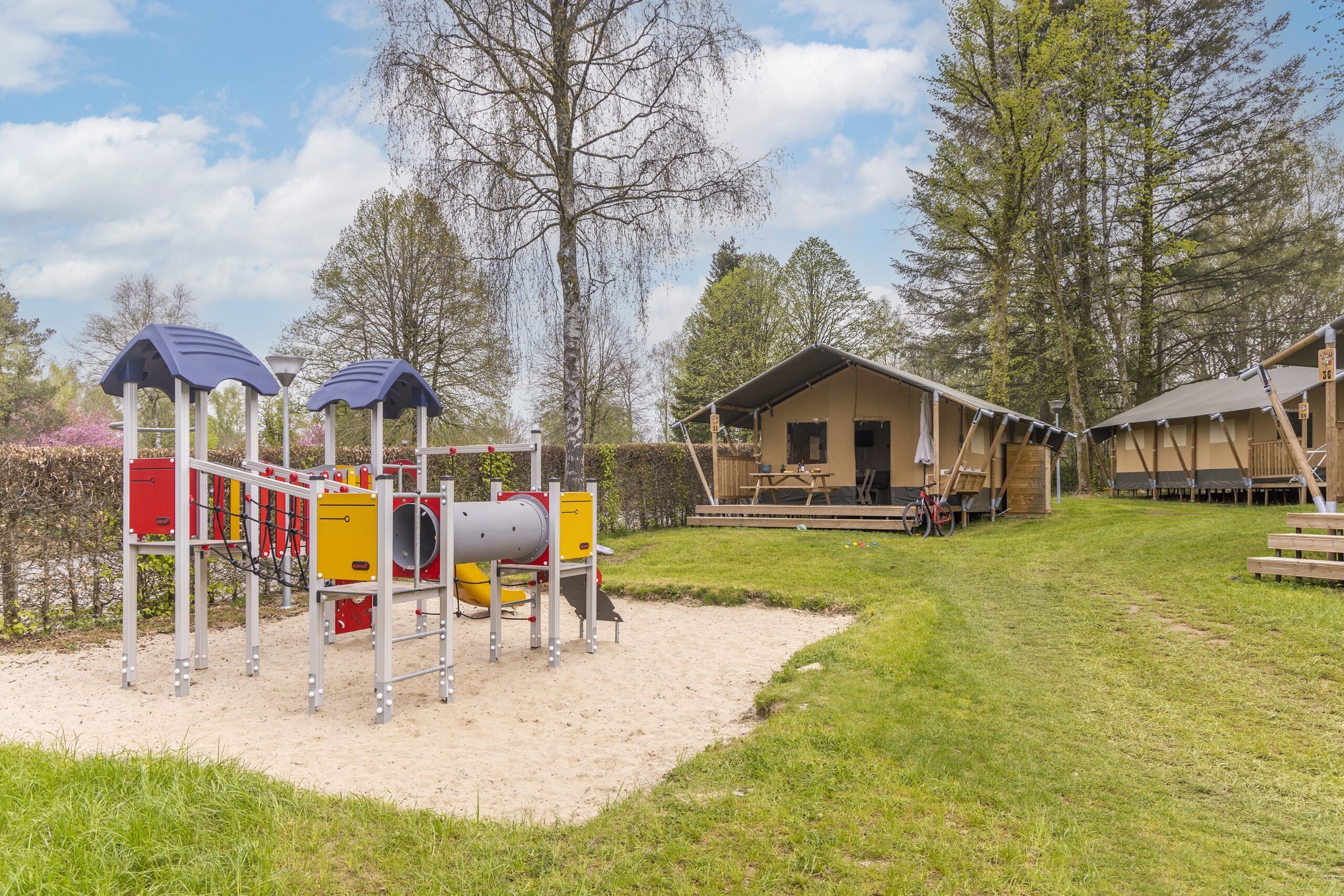 De safaritenten zijn gelegen op een gezellig veldje met speeltuin voor de kinderen.